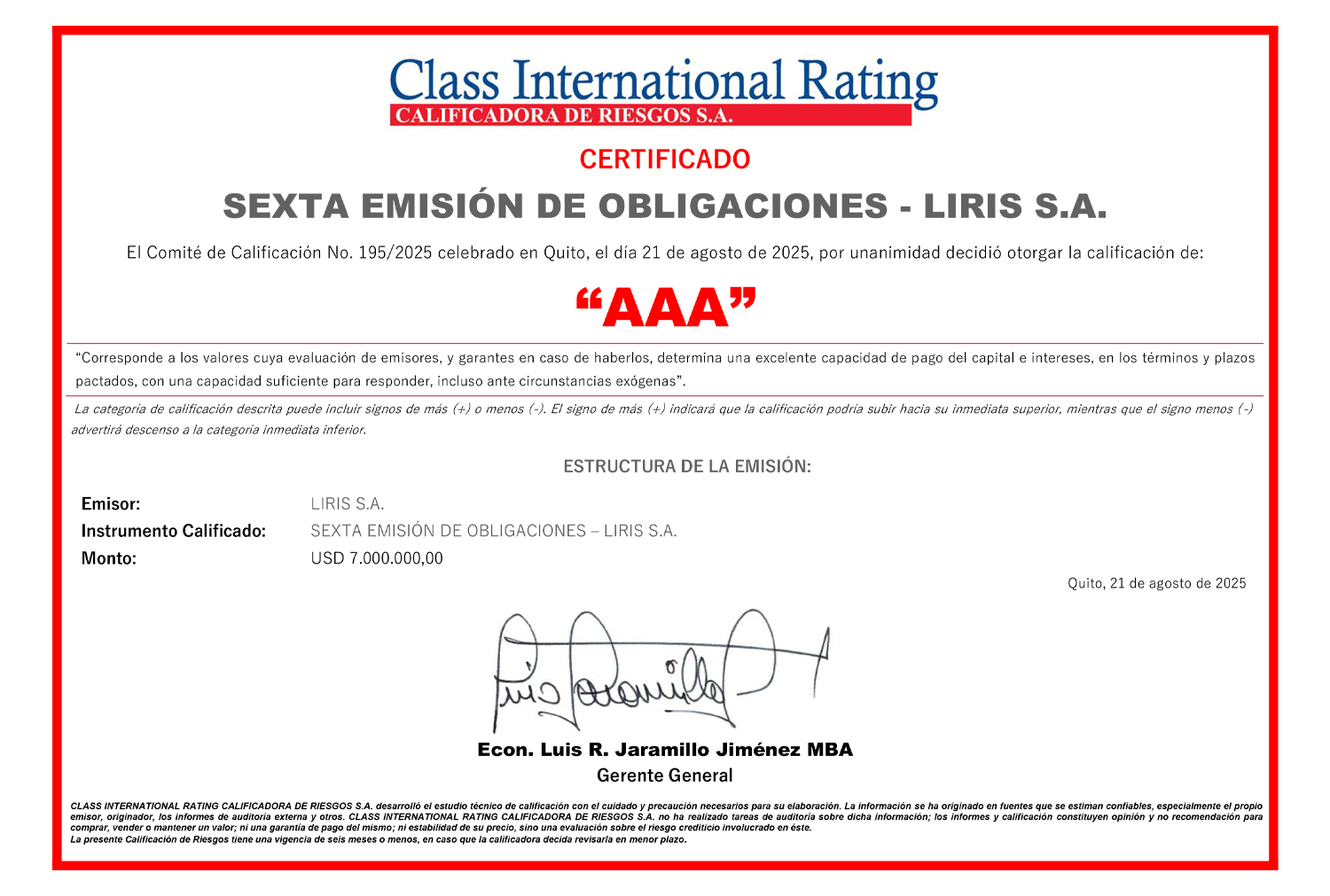 Liris recibe autorización para VI emisión de obligaciones (resolución No. SCVS-INMV-DNAR-2023-00037369)